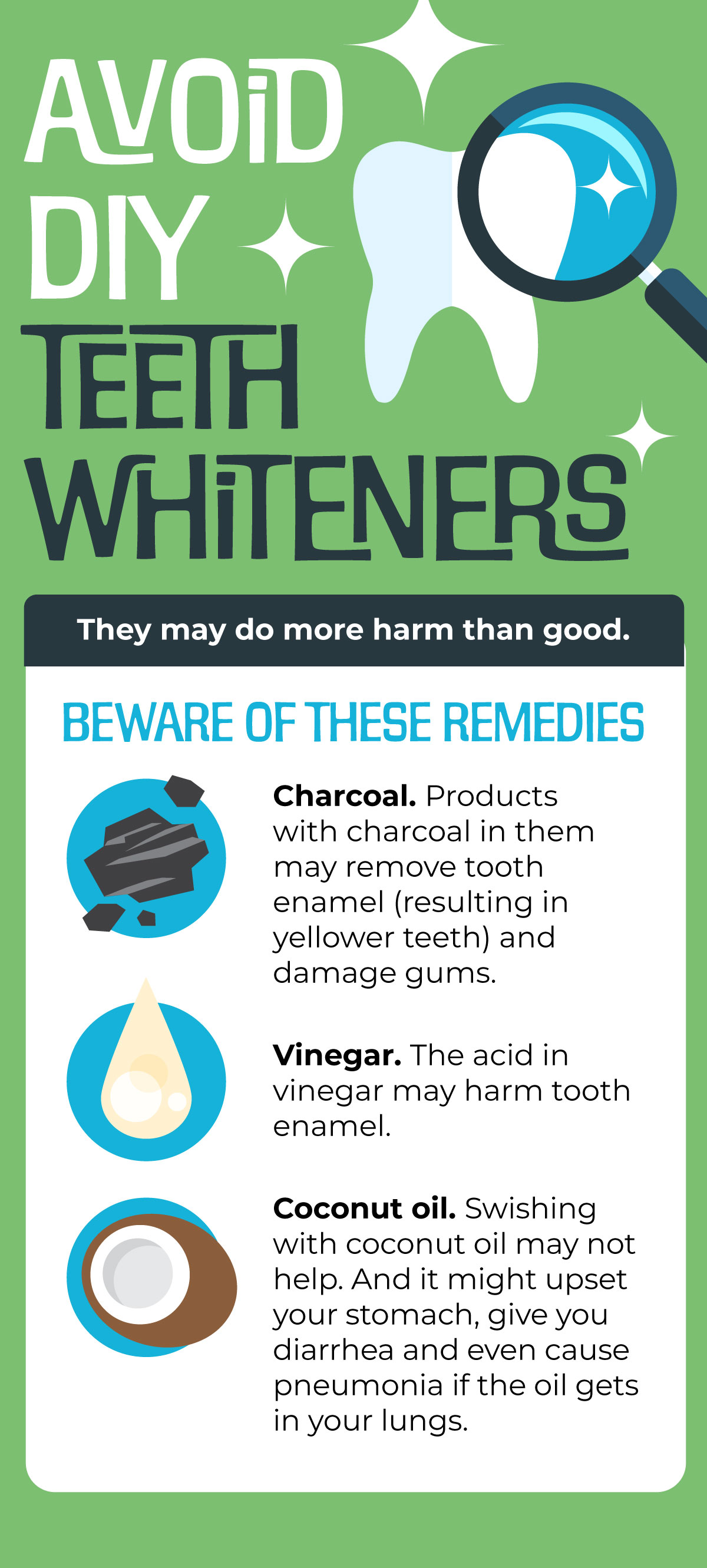 Coconut oil. Swishing with coconut oil may not help. But it might upset your stomach, give you diarrhea and even cause pneumonia if the oil gets in your lungs.